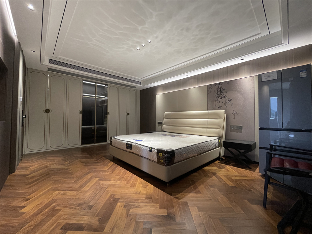 主臥整體風(fēng)格簡(jiǎn)約典雅,色調(diào)各異,增強(qiáng)了整體空間的層次感。剔除瑣碎的空間,干凈舒適,用簡(jiǎn)單的中式擺件營(yíng)造溫馨舒適的休息空間。世俗的噪音和煩惱都與此無(wú)關(guān)。