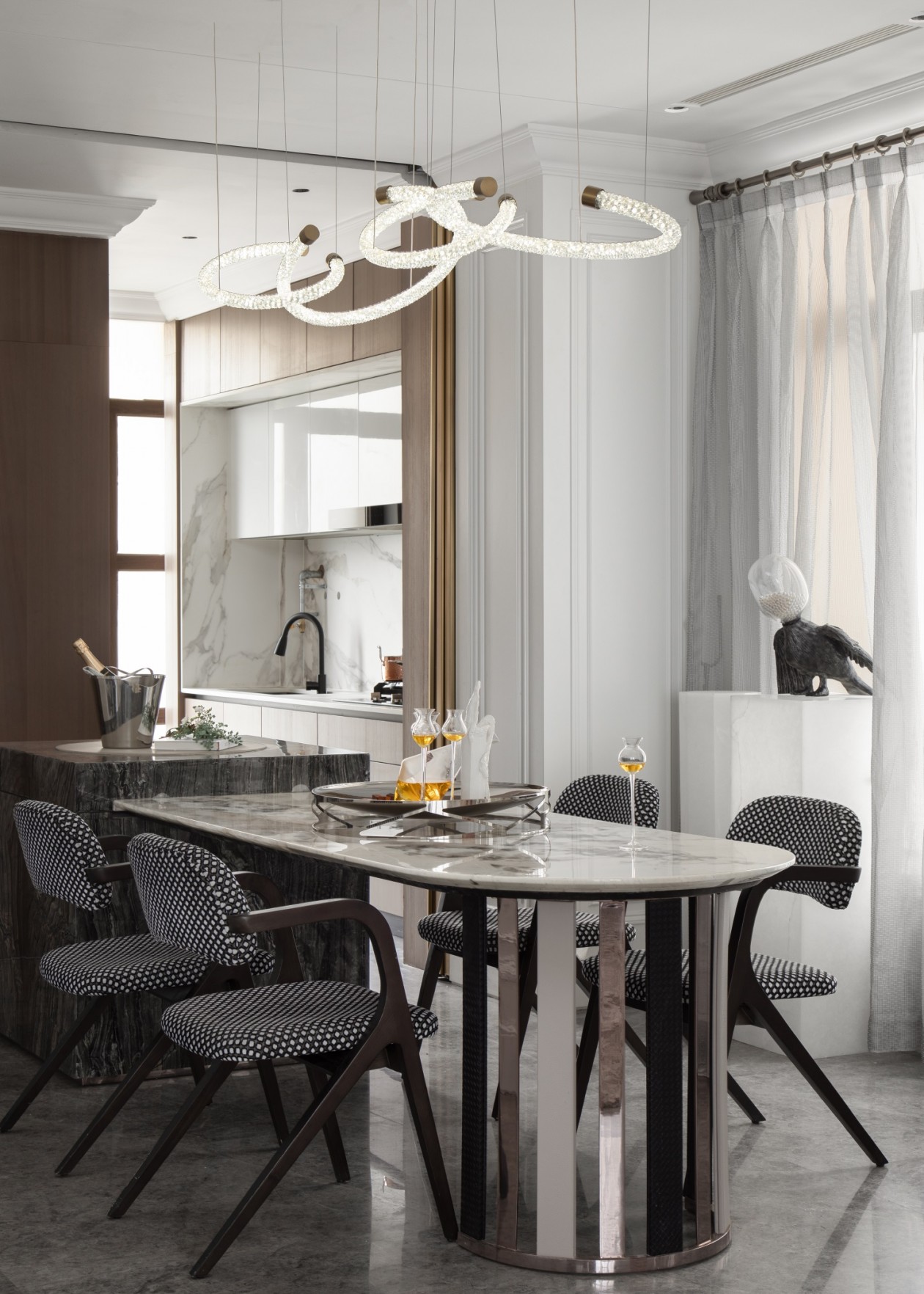 經(jīng)典的空間結(jié)構(gòu),由內(nèi)而外,透著法式線條勾勒出空間復(fù)古奢華的一面,在冷與暖之間玩起了火與冰。