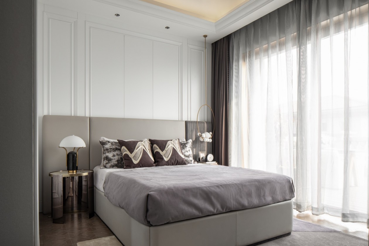 主臥體現(xiàn)出設(shè)計(jì)師形式、流動(dòng)、比例、材質(zhì)、顏色和紋理的平衡控制,注重對(duì)稱的設(shè)計(jì)美感。法式和復(fù)古的意境讓空間縈繞著藝術(shù)和過(guò)往歲月的氣息,空間形成一種向外擴(kuò)之張力,盛世如波濤洶涌。