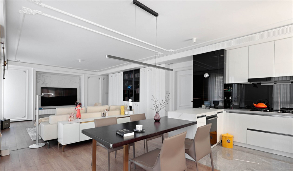 多功能廚房、黑色巖板和金屬把手與白色的柜面為煙火氛圍增添了一份精致感。