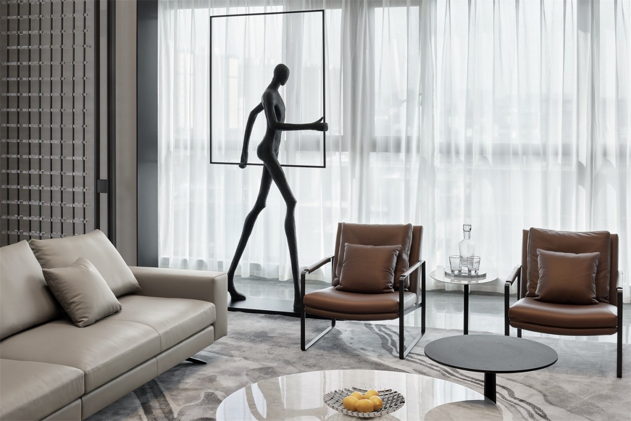 客廳是社交中心,傳遞著主人大方的個性。整體氛圍自有溫馨的感覺,留白與平靜疏淡的布局。被斜放在一個水晶屏風里,讓渡于獲得內心秩序與安寧的光,像詩人一樣,懂得欣賞黎明的來臨。