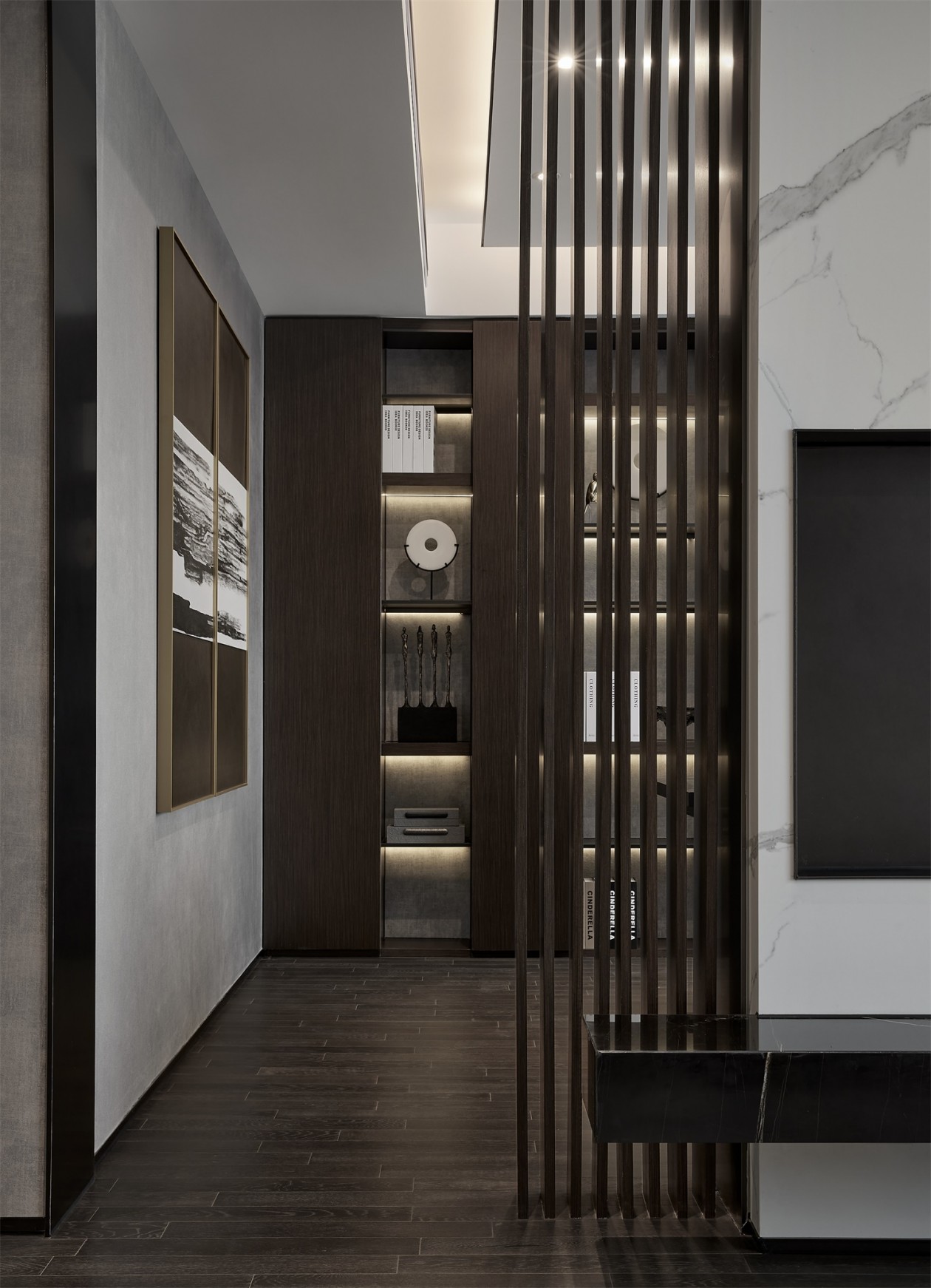 玄關的設計盡顯其好。從入門開始,玄關就像是個性傳達的引子,設計與客體一以貫之,既不顯露,也不隱藏,極具個人氣度。